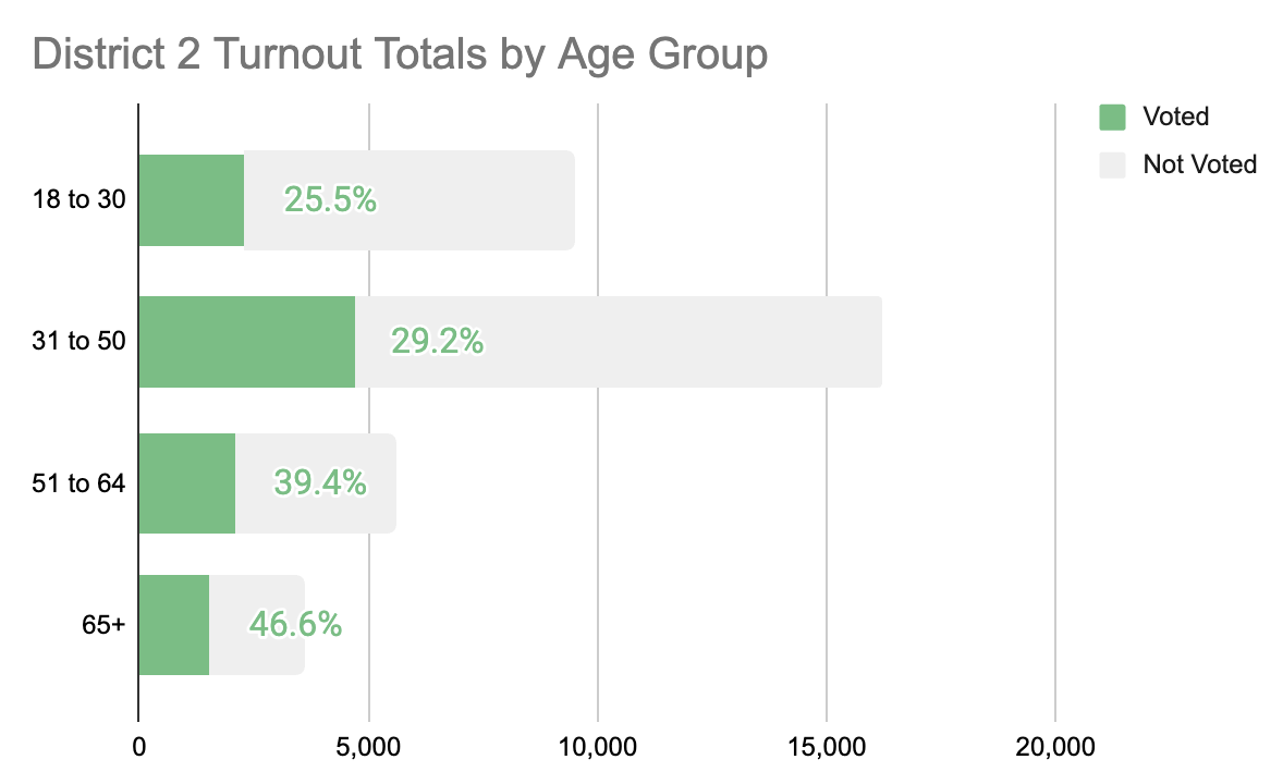 Kelsea especially shined among the youth. The campaign expanded the electorate by driving up youth turnout among under-30 voters significantly higher than the citywide average (almost double, in fact). As a result, the 18 to 30 age group had more voters than both age groups for 51 to 64 voters and 65+ voters.
