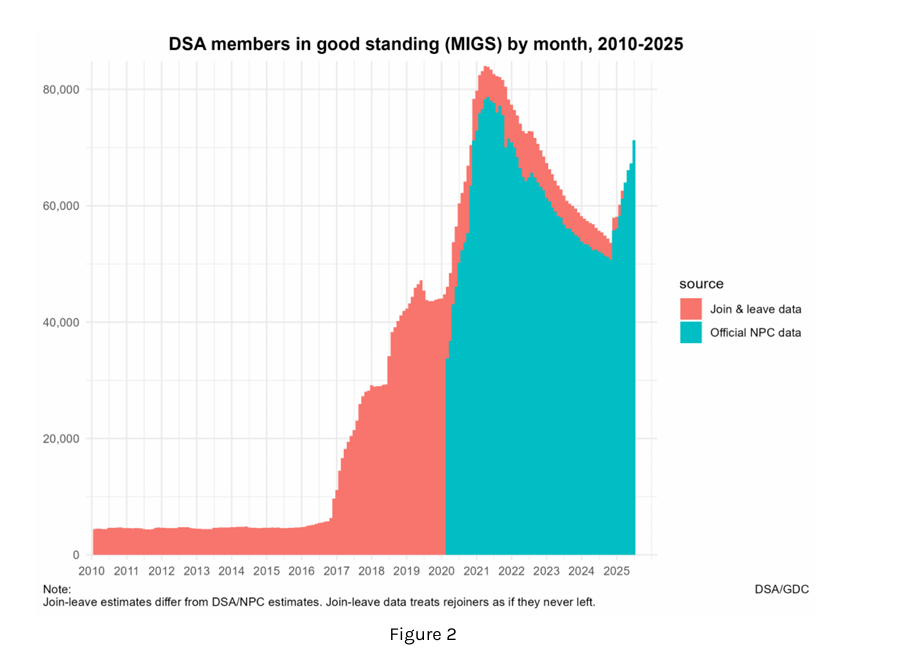 While pre-2021 data is less consistently available due to poor recording practices, national and chapter-level membership data from 2022 onward is publicly available via a spreadsheet provided by national DSA. This data has recently been updated to track Membership In Good Standing, so it can be consulted easily without inadvertently conflating different methods of calculating membership.