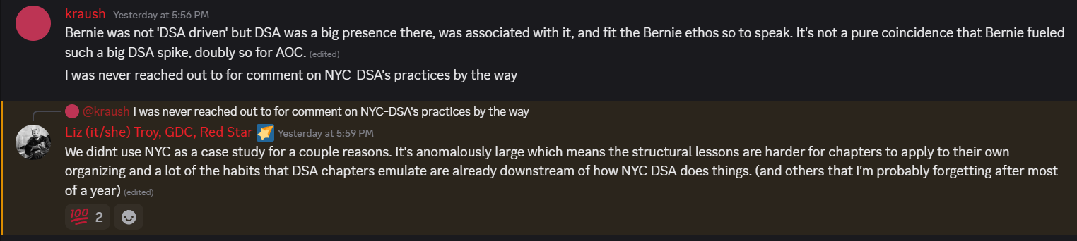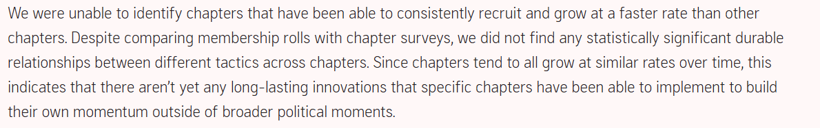 One of the most glaring omissions from the quantitative elements of this report was the comprehensive exclusion of NYC-DSA from the analysis. I was the chapter membership coordinator during much of the period the GDC report covers, and it was clear that we outperformed in 2024. Despite this, I had never received 1-1 outreach from the GDC team, and it was recently confirmed to me by a GDC member that this was a deliberate decision because we were ‘anomalously large’.
