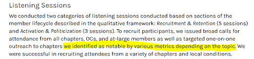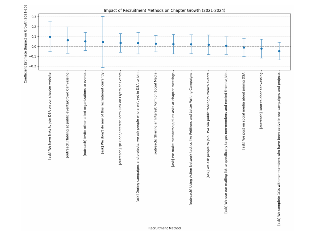 While the survey response analysis in the GDC report does include list-building tactics such as letter writing campaigns, this may be misleading. What do chapters mean when they say they use tactics like letter writing campaigns? How many chapters have the infrastructure and understanding to quickly produce and circulate these in response to external events? How effective have these chapters been at growing their lists through these means? I believe chapter practices and capabilities would differ significantly here, making the quantitative analysis of the ‘effectiveness’ of these recruitment methods qualitatively flawed.